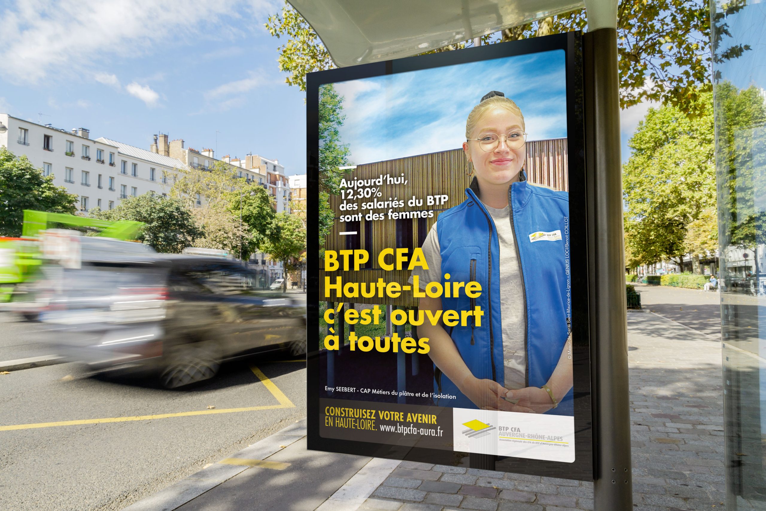 Parce que changer les mentalités et les regards ancrés dans le passé demande de la puissance de communication, l’agence opte pour un plan de communication fort et impactant partout en Haute-Loire. Réseau d’affichage, campagne radio, campagne flanc de bus, communication sponsorisée et ciblée sur les réseaux sociaux, relais des institutions de la branche BTP43, portes ouvertes du BTP CFA Haute-Loire… Créativement, la campagne prend le parti de mettre en scène des arguments factuels, directs corroborés par des arguments / preuves aux côtés de personnes en formation (prises de vue réalisées au CFA BTP43). Nous souhaitions un message direct, il ne s’agissait pas pour nous de vendre des choses qui n’existent pas, nous souhaitions ancrer dans le concret et le réel cette campagne.