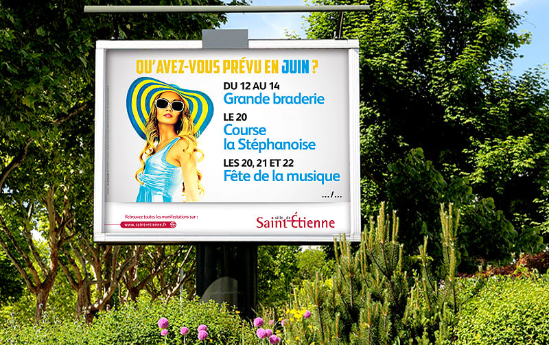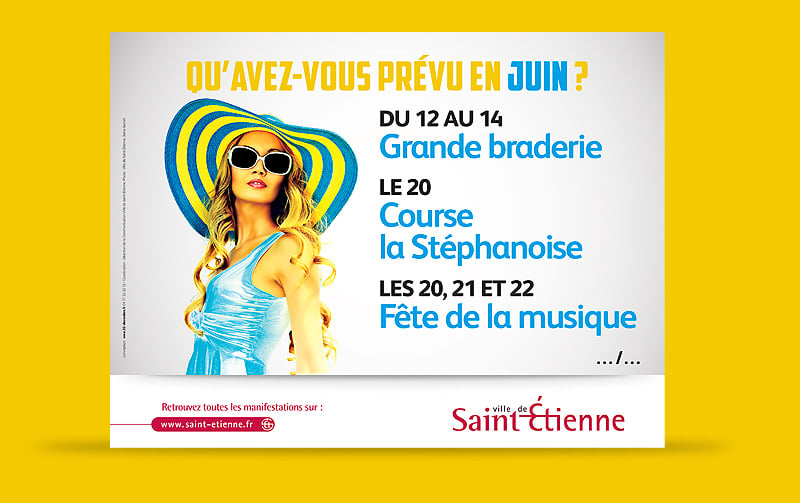 Nouvelle campagne de communication affichée sur le réseau 4X3 pour le mois de juin pour le compte de la Ville de Saint-EtienneLa campagne Agenda propose une mise en lumière des événements de la métropole stéphanoise.