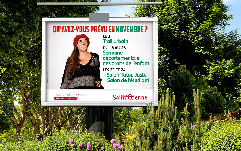 La nouvelle campagne de communication de la Ville de Saint-Etienne est actuellement sur le réseau 4X3 de la métropole stéphanoise. Cette campagne est notamment destinée à valoriser les événements majeurs du mois de novembre à Saint-Etienne.
