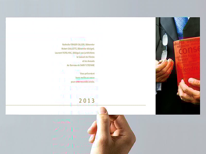 Sur un format carré qui met en valeur tous les rôles et compétences des avocats, la carte de voeux du Barreau de Saint-Etienne prend le parti du cadrage serré sur le livre de loi qui se pare des nombreuses compétences des avocats. Comme pour rappeler tout le panel d’actions des avocats du Barreau de Saint-Etienne.