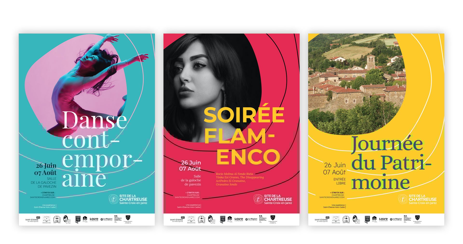 le Site de la Chartreuse de Sainte-Croix-en-Jarez va bien au delà de la seule Chartreuse… Village habité, vivant, vivifiant, nous ne souhaitions pas ancrer la marque dans le passé ou la poussière musée… Au contraire, nous voulions par la marque assortie d’une charte graphique enjouée créer une identité tonique, ancrée dans son temps. Notre volonté était de donner corps, forme et expression à un lieu hors du temps sachant marier passé, présent et futur sans coup férir. Parti-pris typographique, travail graphique matérialisant le lieu, sa topographie et la porte ouverte vers la découverte, il nous reste aux visiteurs qu’à franchir le pas. Derrière, la charte se veut expressive, mobile et dynamique ; elle permet d’ancrer la marque dans un temps qu’on ne lui connaissait pas. Concerts, animations peuvent ainsi s’exprimer dans ce lieu magique.