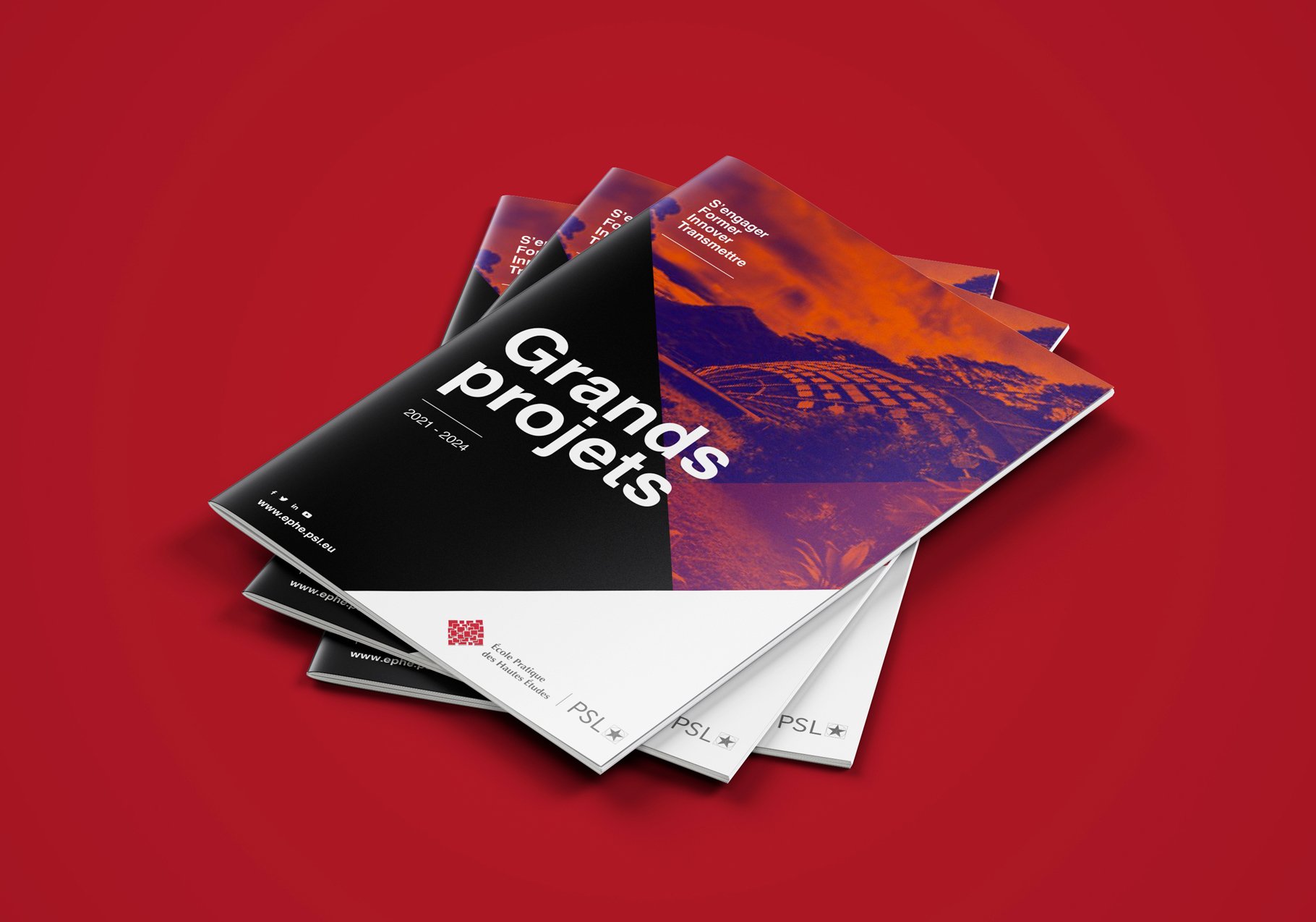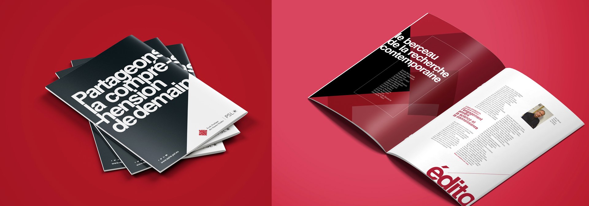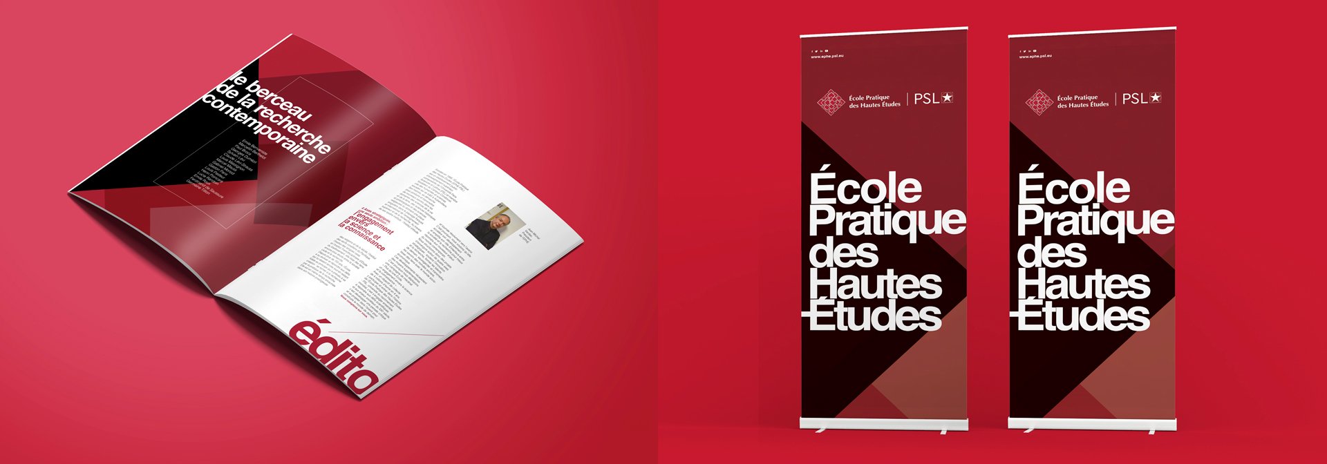 Dans ce ce projet de création de charte graphique de l’École Pratique des Hautes Études, nous avons souhaité travailler une expression graphique engagée, engageante, et différenciante. Via cette création d’identité de communication, nous souhaitions dans le geste créatif porter haut les couleurs de l’École Pratique des Hautes Études et travailler la dimension, la perception comme l’attrait de l’école. Il s’agit pour l’école de séduire de nouveaux publics étudiants. Les partis pris de création sont modernes, respectueux des acquis et permettent à l’institution de dépoussiérer les codes comme de s’affirmer dans le paysage des grandes écoles. La charte se décline sur tous les supports de l’institution, ainsi toute la communication print et digitale sont mises à jour et uniformisent le style.