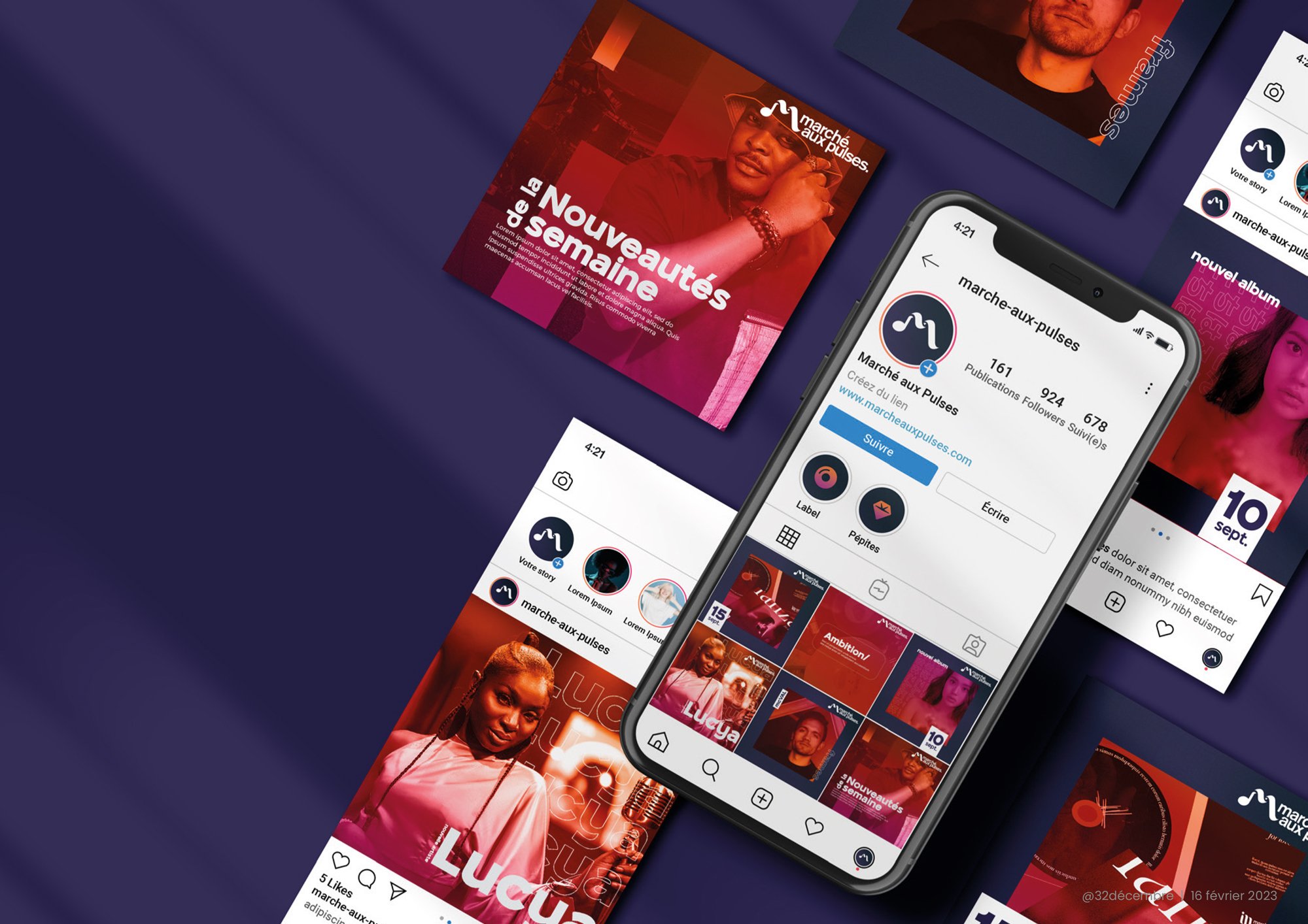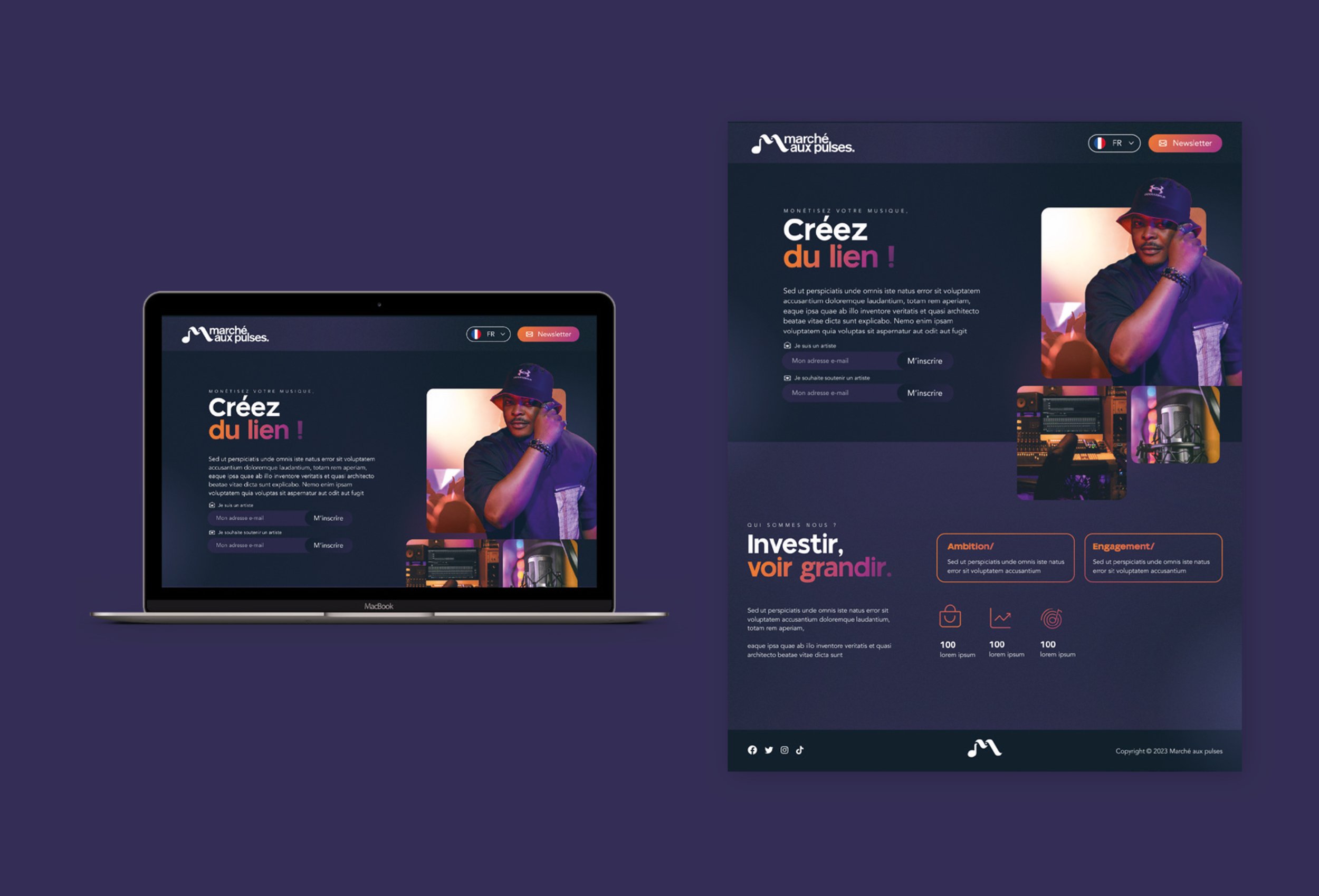 L’image de Marché aux Pulses est une symbiose harmonieuse de créativité et de professionnalisme. L’agence a conçu un logo distinctif, plein de musicalité, qui évoque à la fois un spectre sonore en expansion et un engagement financier solide. Ce logo symbolise la dualité de la plateforme : la passion artistique et la viabilité financière. La sobriété typographique renforce l’image de professionnalisme tout en évoquant l’unicité du projet. Le violine, une couleur à la fois sobre et mystérieuse, a été choisie pour envelopper Marché aux Pulses de son aura. Élégance, créativité et authenticité autant de valeurs chères à cette plateforme.