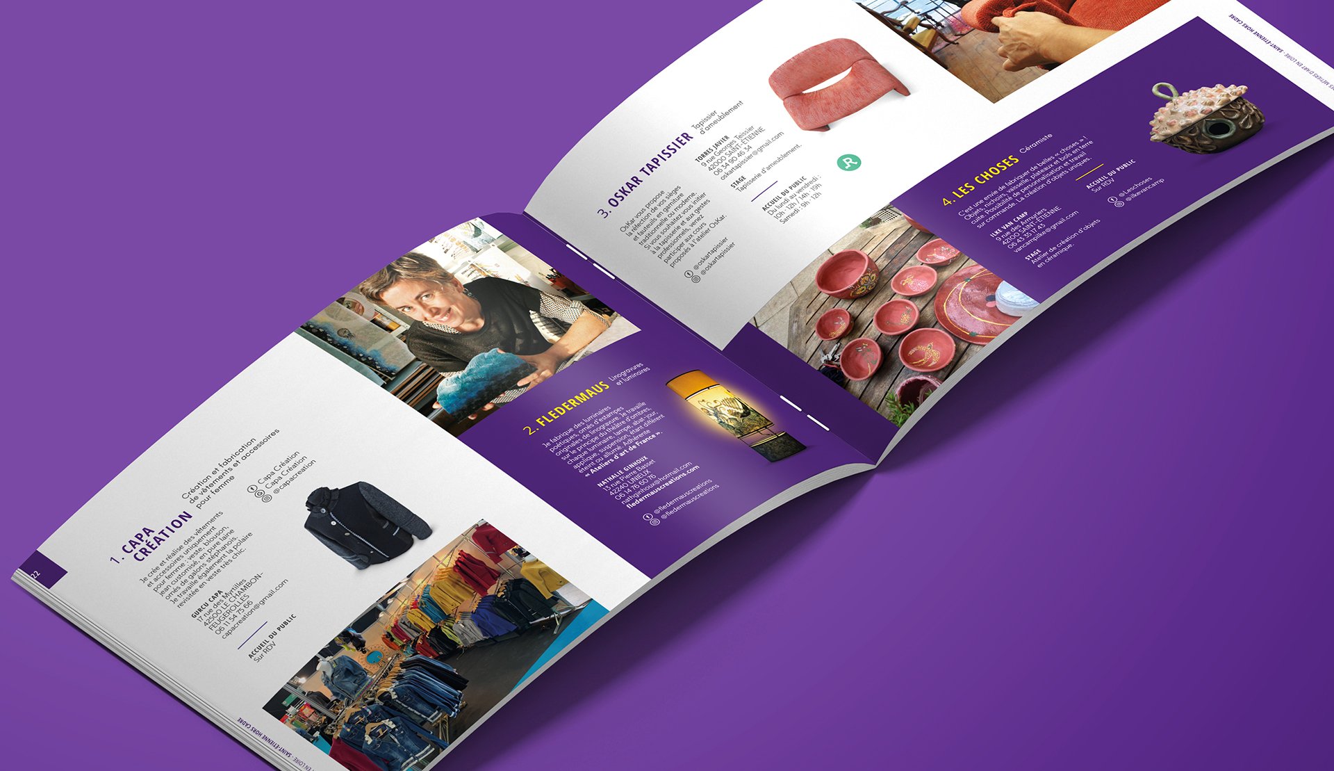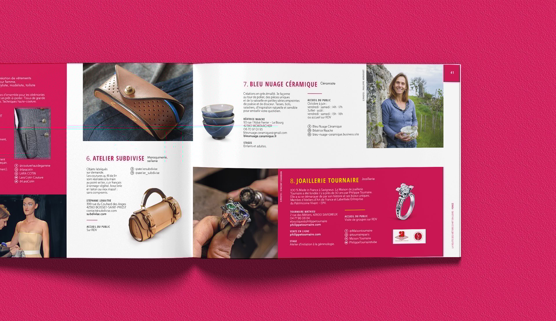Notre objectif était ainsi d’élargir la perception des métiers d’art dans la Loire en leur donnant une expression forte et positionnante. Le parti pris colorimétrique va dans ce sens via des choix couleurs qui pep’s et qui tranchent. L’utilisation d’aplats permet d’ajouter du dynamisme aux pages et de jouer de tensions chromatiques particulières.