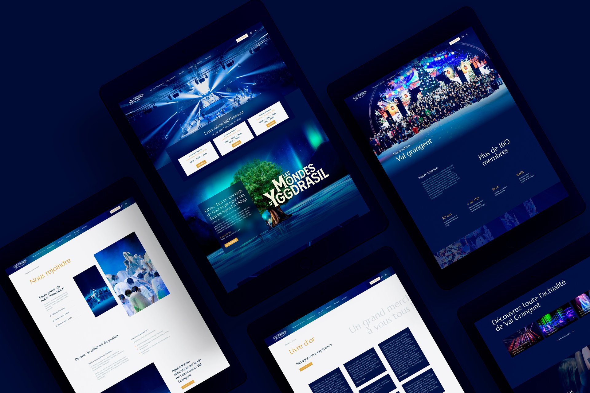 Au-delà d’une simple refonte de site pour répondre aux exigences actuelles en termes de site e-commerce, l’agence travaille en profondeur la perception de l’association à travers ses spectacles. Après de nombreuses années d’existence, l’association a en effet gagné en expérience et peut aujourd’hui se comparer à des spectacles professionnels. Que ce soit au niveau de la mise en scène, des effets sons et lumière ou encore des décors et costumes, l’association Val Grangent offre des spectacles grandioses. Ainsi, nous avons naturellement inclus ce volet dans notre démarche créative pour qu’il n’y ait plus de doute quant à l’ampleur des spectacles Val Grangent. Dans cette lignée, nous empruntons les codes du milieu et choisissons volontairement de placer le spectacle de l’année en première ligne avant l’association en tant que telle. Nous valorisons les moyens et le spectacle en travaillant un site très immersif.