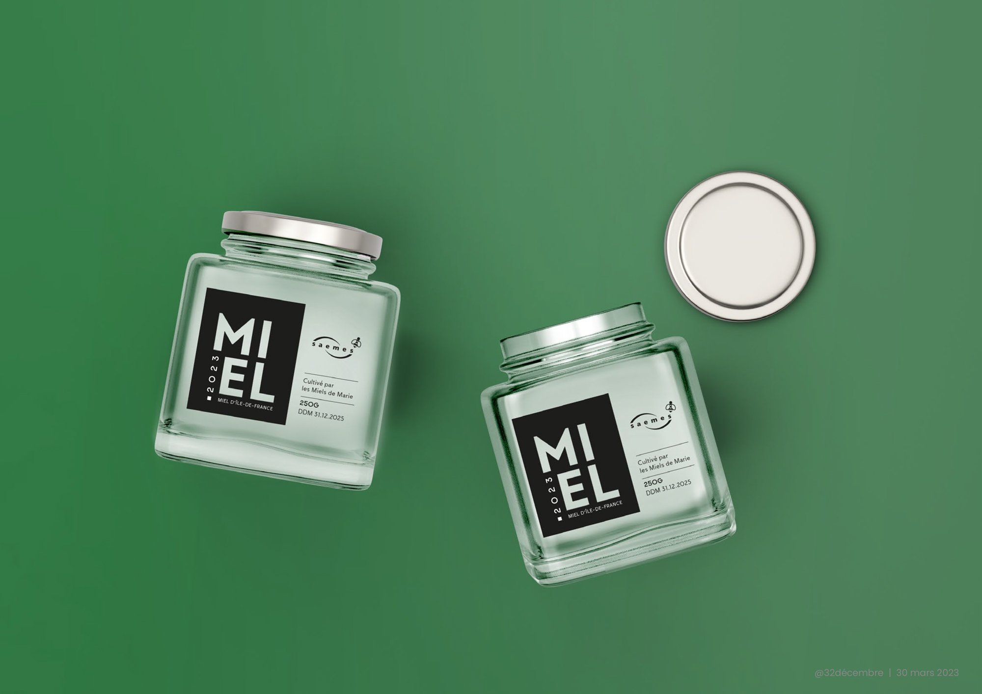 Ce miel précieux est bien plus qu’une douce gourmandise. Il incarne l’engagement de Saemes envers ses grands comptes, ses actionnaires, ses clients fidèles, et son désir de partager des moments d’exception lors de salons professionnels prestigieux, tels que Parkopolis, Rétromobile, et les inaugurations de parkings qui marquent l’urbanité parisienne. Pour l’année 2023, Saemes désire sublimer ce packaging et confie cette mission à 32 Décembre. L’agence relève le défi de créer une étiquette de miel d’exception, à la hauteur de l’engagement de Saemes envers la biodiversité et ses partenaires.