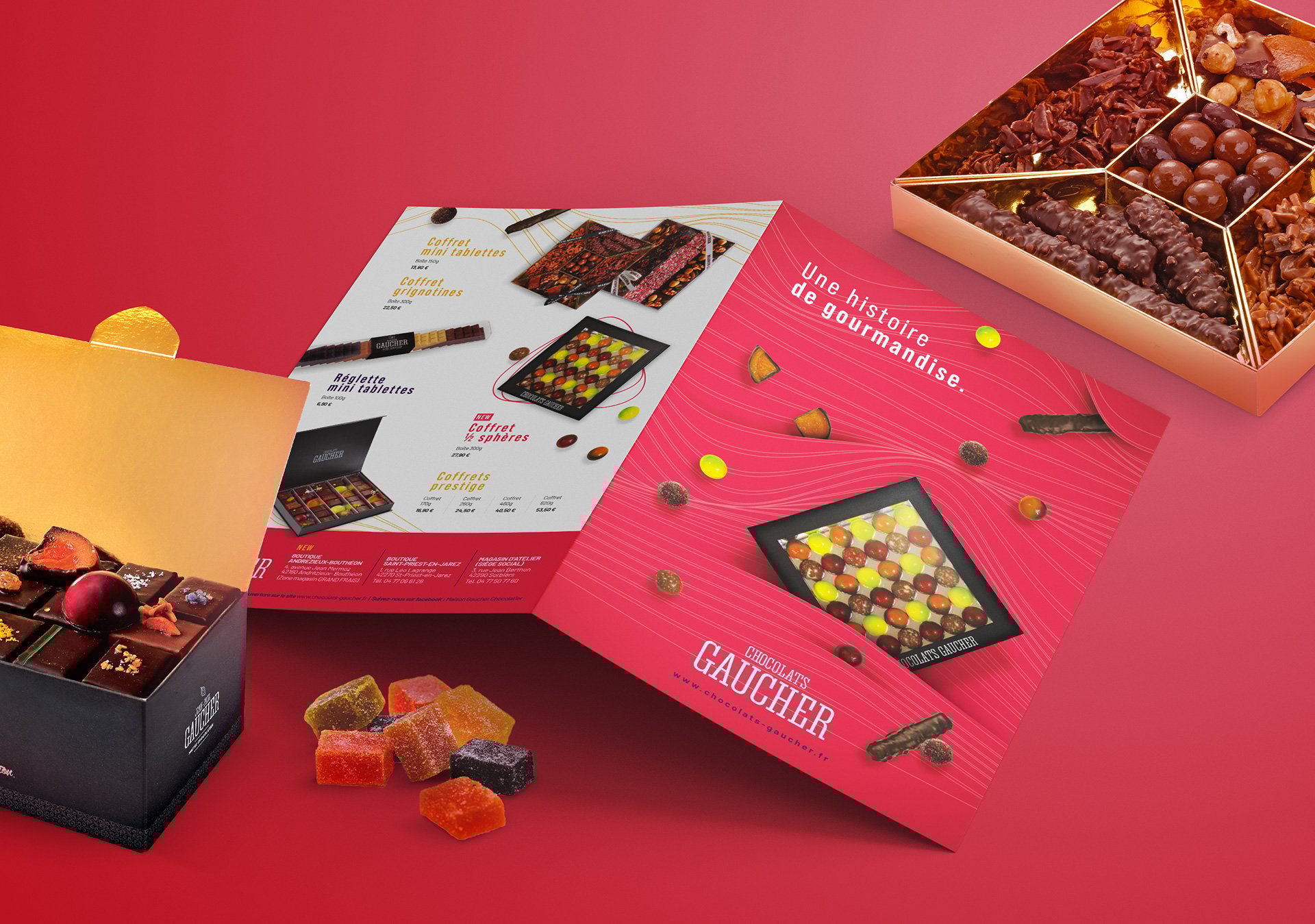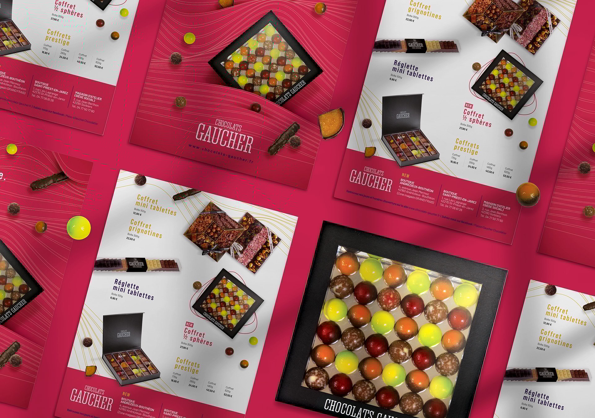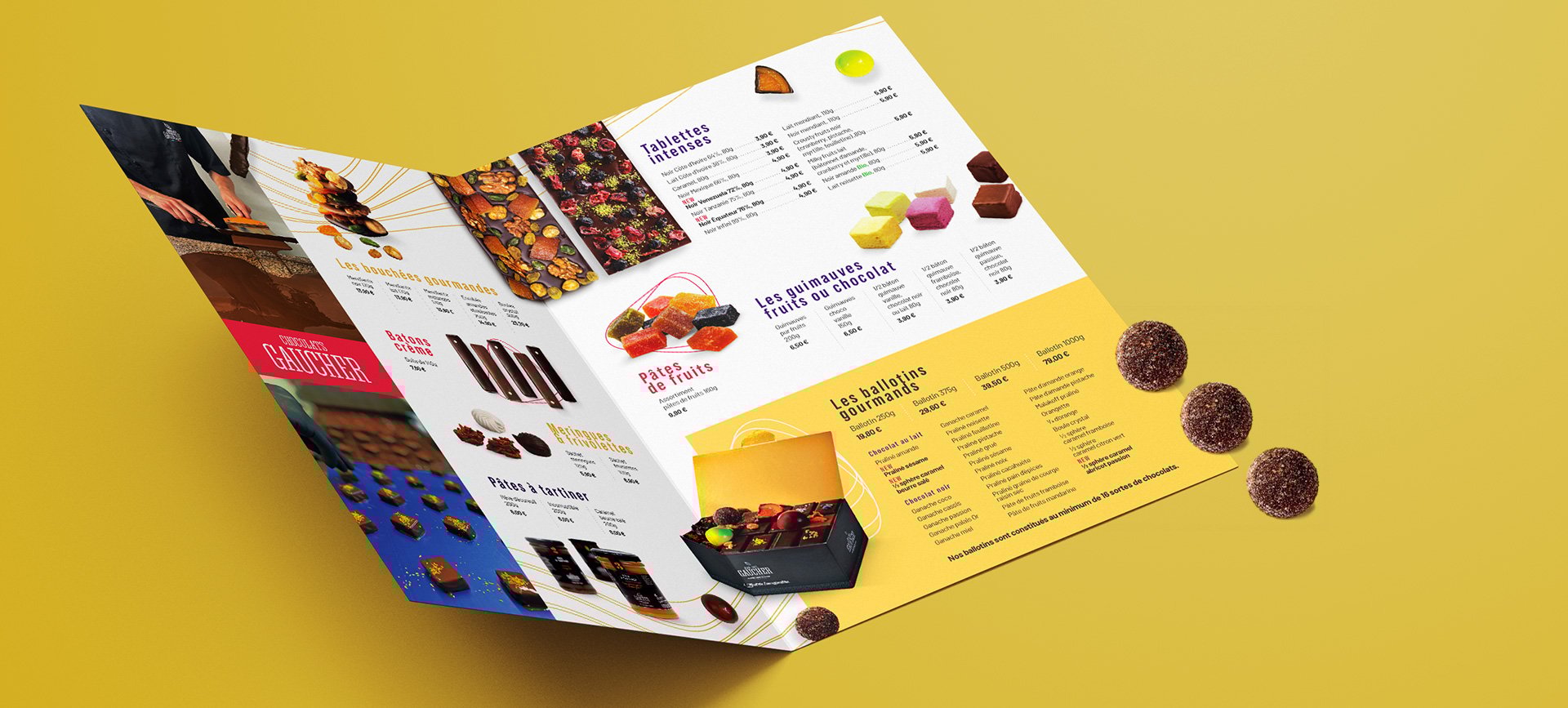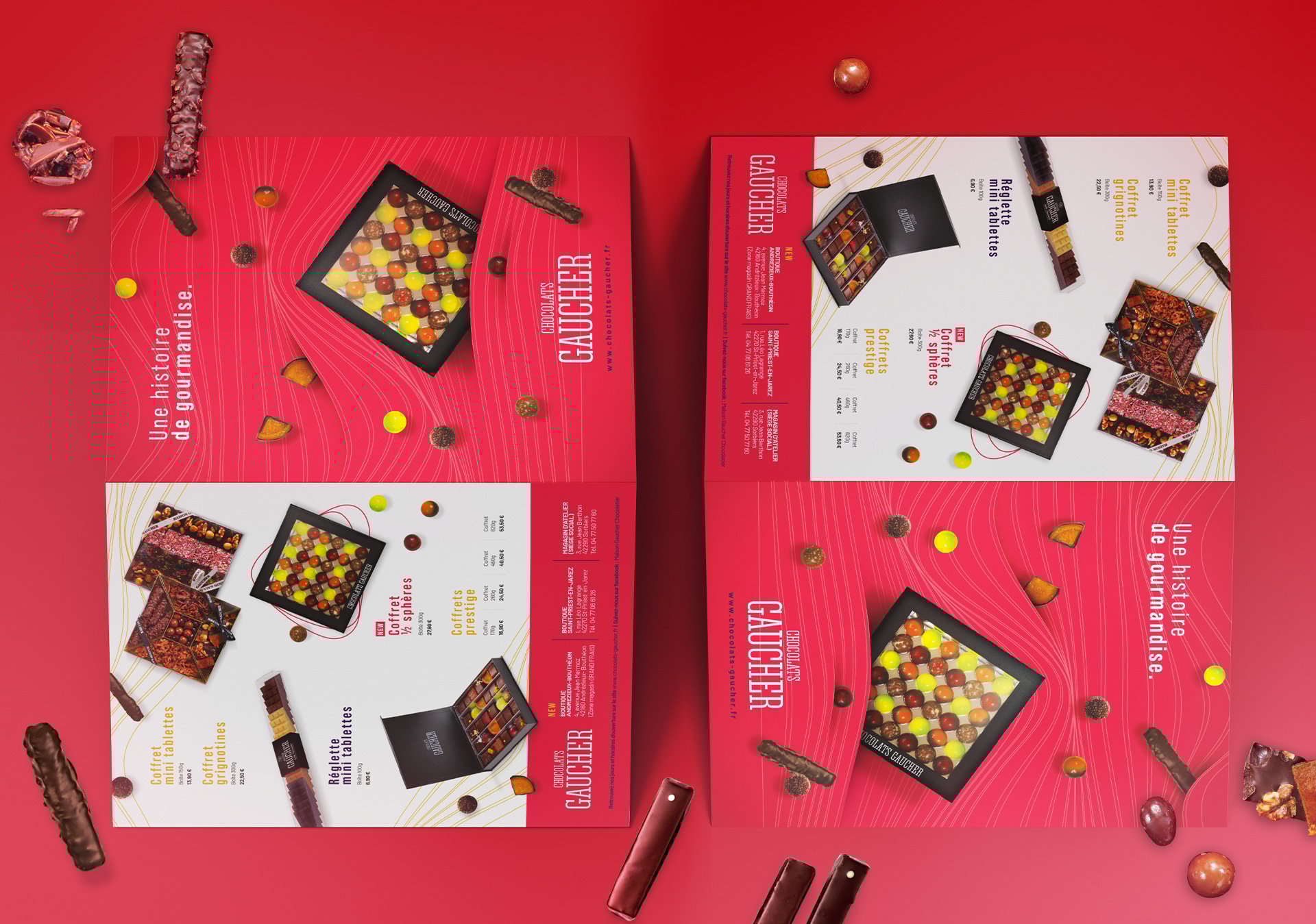 Comme pour l’ensemble des projets que nous menons, nous sommes très sensibles quant au respect des valeurs et de l’ADN des chocolats Gaucher. De cette manière, nous travaillons une plaquette valorisant les savoir-faire du chocolatier, sans esbroufe. Simplicité, technique traditionnelle et produits de qualité, voici ce dont regorge la plaquette chocolat. Ainsi, autour d’une mise en page dynamique et fluide, nous veillons à accorder la place nécessaire à chaque gamme de produit afin qu’elle puisse s’exprimer pleinement.