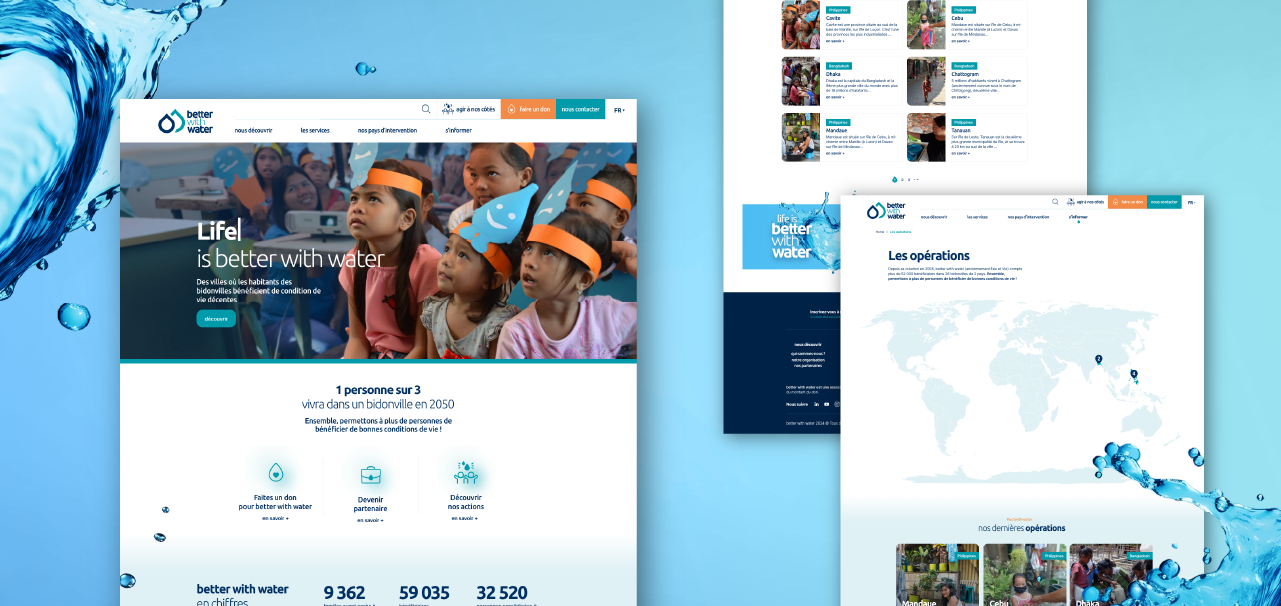 L’objectif était de communiquer avec clarté la mission et les valeurs de l’organisation, tout en apportant un souffle de renouveau. Le premier aspect de ce rafraîchissement a été le naming. Le choix de « better with water » résonne d’une évidence touchante. L’eau est indéniablement synonyme d’une vie meilleure. L’eau impulse hygiène, sécurité et développement. Cette nouvelle appellation capte l’essence de la mission d’Eau & Vie et l’ouvre à un avenir lumineux. Elle évoque une promesse d’amélioration de la qualité de vie, d’espoir et de progrès.