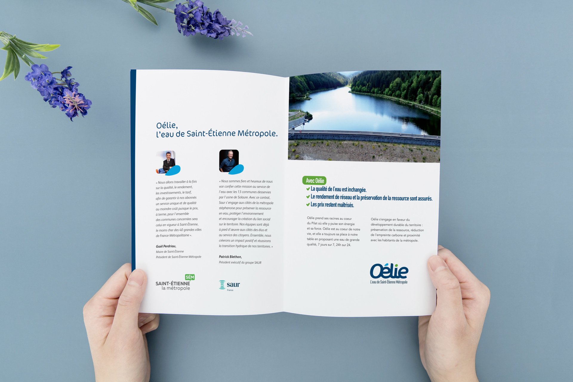 Officiellement présentée le 09 mai 2022 au siège de Saint-Étienne Métropole, la marque baptisée Oélie par un confrère exprime le lien de l’eau avec son territoire. Oélie prend ses racines au cœur du Pilat où elle y puise son énergie et sa force. Oélie est au cœur de la vie du territoire, et elle a toujours sa place à table en proposant une eau de grande qualité, 7 jours sur 7, 24h sur 24.
